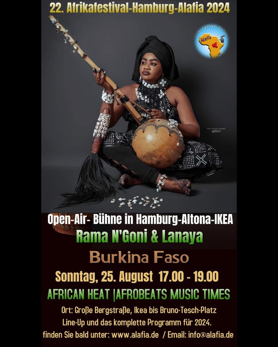 Das ist eine Sensation: Rama N'Goni ist eine der wenigen N'Goni-Spielerinnen Afrikas: dieses Instrument ist eigentlich den Männern vorbehalten: Rama bricht diese Tradition. Sie wird begleitet von Lanaya um den Musiker aus Burkina Faso: Abdul Aziz Sinka, einer der regesten Musiker aus Burkina. Er ist in berlin Veranstalter des Woka-Kuma Festivals (13.09.2025 in der FORUM FACTORY, Besselstr. 41, 10999 Berlin: www.woka-kuma.de) Dieses Konzert bietet Burkina Faso pur! Hier treffen sich harte Percussion-Rhythmen mit der Melodie der N’Goni. Doch über allem liegt die fabelhafte Stimme der Sängerin Rama. Feel the Vibes.